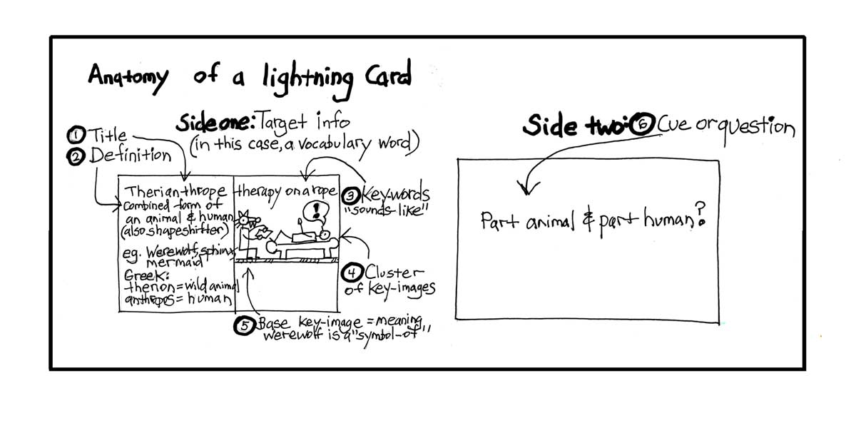 A Lighting Card is a cluster of items that are interrelated to act as memory cues. It employs a specific variation of the “key-image method.” Each card is made up of clusters of text, labels, and spark sketches organized like a cluster diagram (mind-map). Spark-sketches are fast simple sketches, interspersed with text, that represent the key-words and key-images. The Lightning Cards and its slots facilitate a spaced repetition schedule. Each review is like a frequent low-stakes quiz. Each card is reviewed in a form of active learning where the material is test-recalled at progressively longer and longer intervals—for instance: daily, weekly, monthly, quarterly