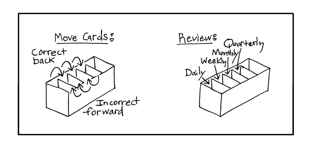 The review system schedule is highly simplified and easy to make into a habit. The card is removed from the box at its designated review time. The cue-question is read from the back of the card, without looking at the answer side. The mnemonic is then recalled from memory and visualized, and then the target-information is also recalled and usually spoken out-loud. If the recall was correct, then the card is placed back one slot, (for less frequent review). If the recall was incorrect, then it goes forward one slot (for more frequent review).